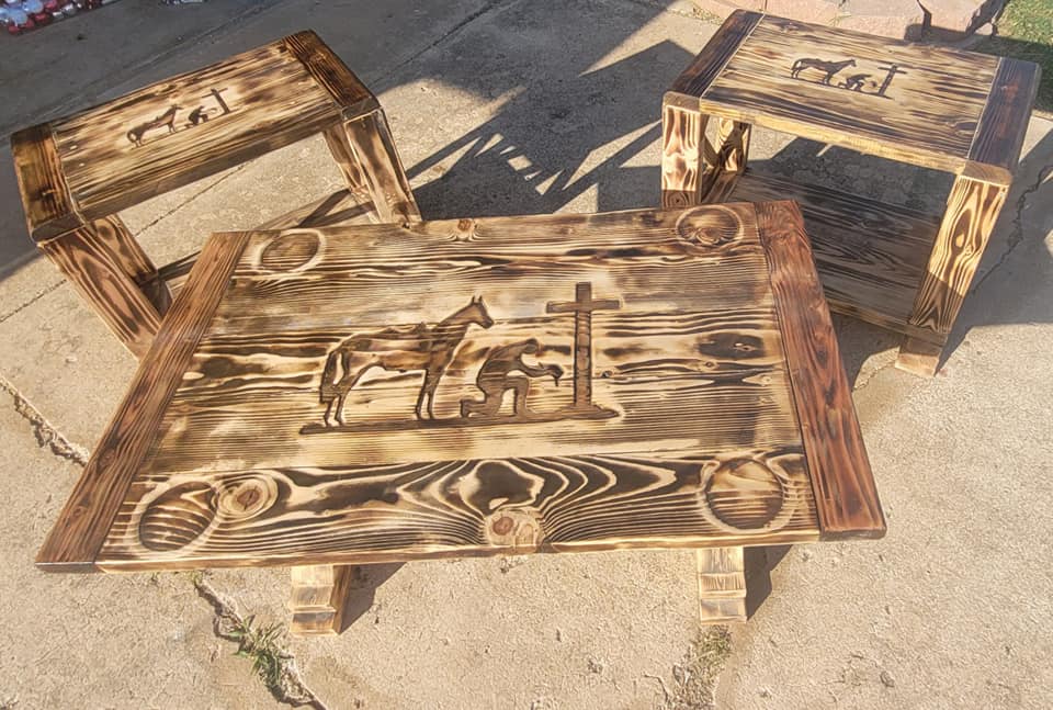 Hand routed, wood burnt, coffee table with side tables is a great addition for the one that loves beautiful furniture! With being extremely sturdy and well built, it adds a touch of rustic to any home or office setting!